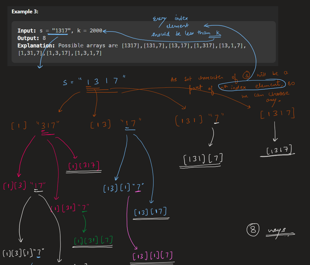 public int numberOfArrays(String s, int k) {